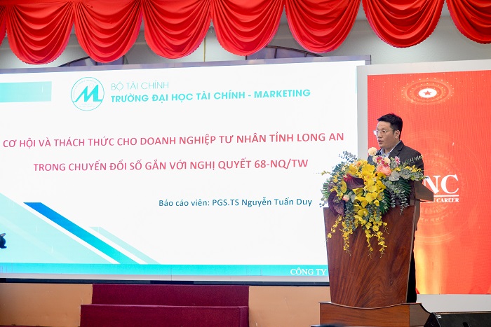 PGS.TS. Nguyễn Tuấn Duy trình bày tham luận: “Những cơ hội, thách thức đặt ra cho doanh nghiệp tỉnh Long An trong quá trình chuyển đổi số”