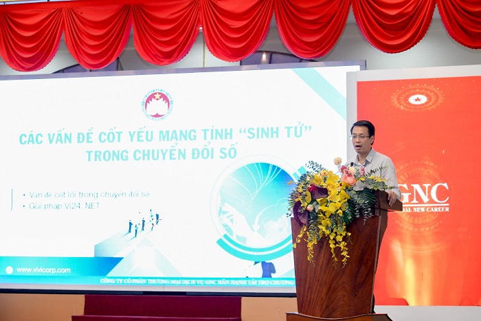 Ông Phan Anh Linh, Trung tâm Chuyển đổi số và Công nghệ Xuất bản - Hội Xuất bản Việt Nam trình bày tham luận “Một số vấn đề cốt yếu mang tính “sinh tử” trong chuyển đổi số doanh nghiệp”