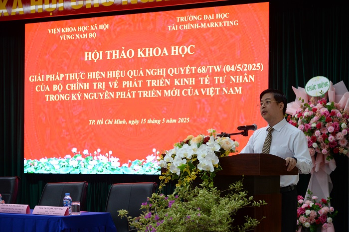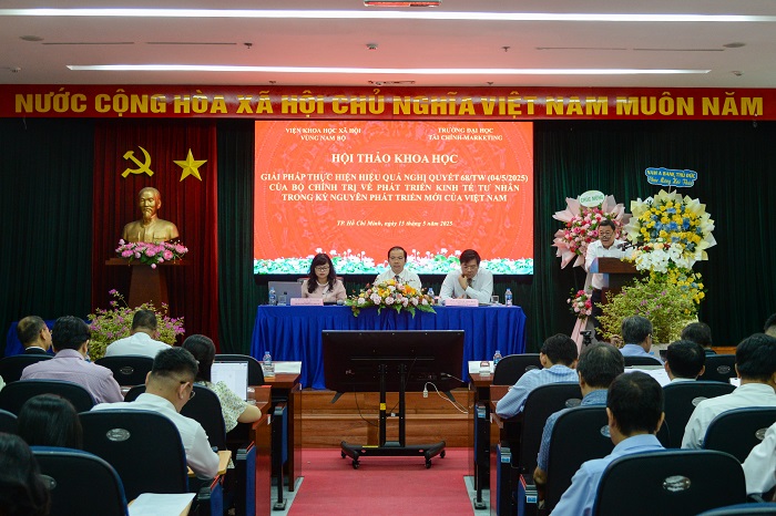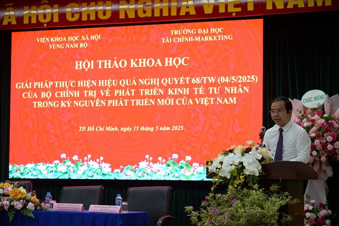 Thể hiện tinh thần chủ động, trách nhiệm và vai trò tiên phong của UFM trong tham gia đồng hành cùng các chính sách phát triển kinh tế quốc gia, sáng ngày 15/5/2025, Trường Đại học Tài chính – Marketing (UFM) phối hợp cùng Viện Khoa học xã hội vùng Nam Bộ tổ chức Hội thảo khoa học với chủ đề “Giải pháp thực hiện hiệu quả Nghị quyết 68-NQ/TW (ngày 04/5/2025) của Bộ Chính trị về phát triển kinh tế tư nhân trong kỷ nguyên phát triển mới của Việt Nam”.